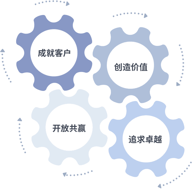 成就客户是一切决策的出发点,,,创造价值是衡量所有工作的标准,,追求卓越是我们做事做人的态度,,开放共赢是我们的格局也是最终的结果。。价值观的齿轮环环相扣,,,,推动着组织里的每个人不断向前。。。。