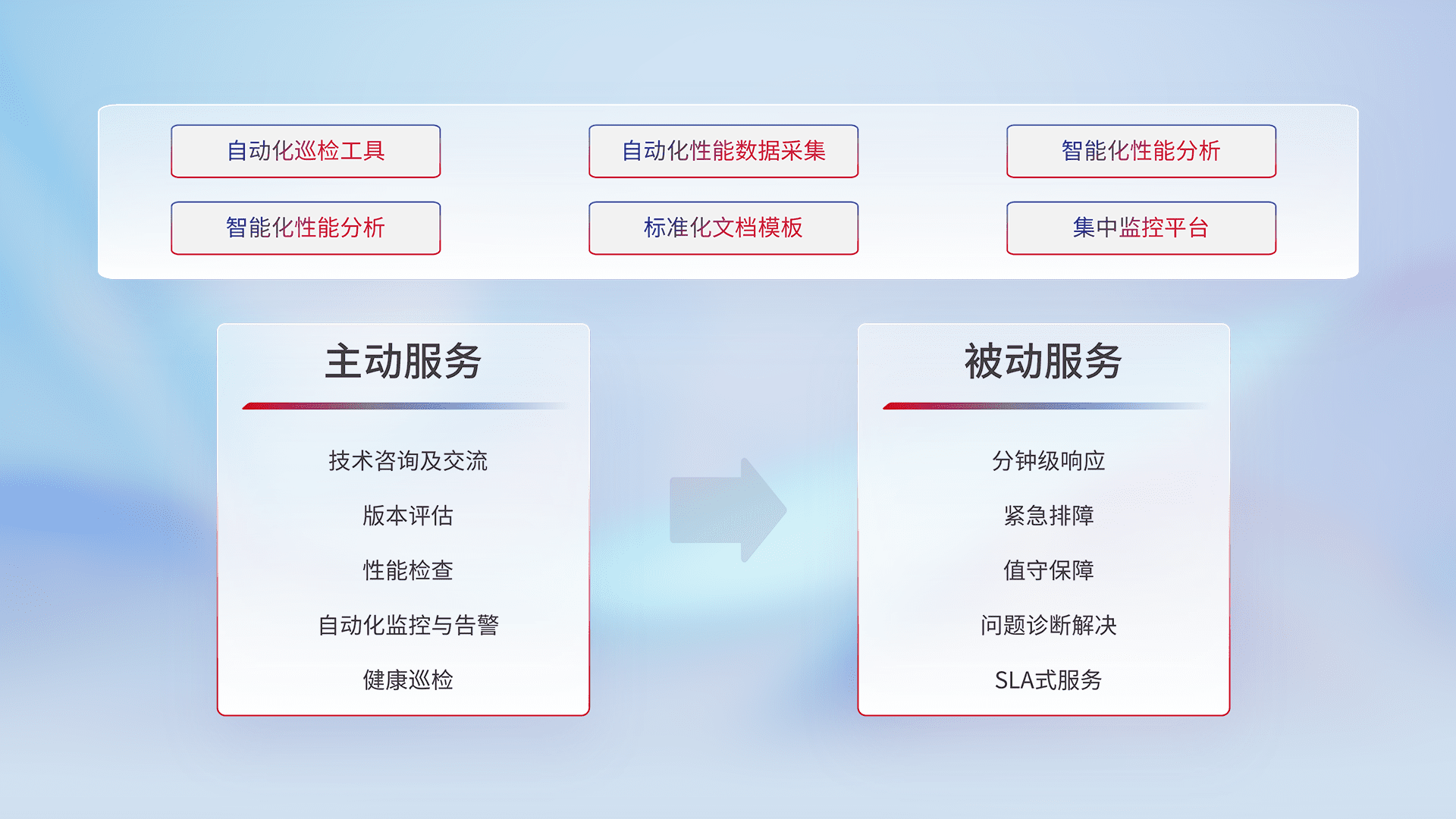智能化工具和标准化文档,,,,保障服务质量,,,提供主动服务(包含技术咨询、、、版本评估、、、、性能检查、、自动化监控与告警、、、、健康巡检)和被动服务包含(分钟级响应、、、紧急排障、、、、值守保障、、、问题诊断解决、、、、SLA服务)。。